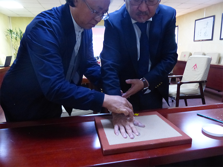 在認(rèn)真聽(tīng)取了我集團(tuán)秦升益董事長(zhǎng)介紹的仁創(chuàng)砂產(chǎn)業(yè)目前現(xiàn)狀及自主創(chuàng)新發(fā)展的砂產(chǎn)業(yè)7大領(lǐng)域時(shí),蒙古國(guó)領(lǐng)導(dǎo)們感觸頗多。仁創(chuàng)科技集團(tuán)點(diǎn)沙成金,科技用沙的創(chuàng)新思想,使一沙一世界得到了充分印證,仁創(chuàng)砂產(chǎn)業(yè)在未來(lái)的發(fā)展將會(huì)越來(lái)越好。在最后蒙古國(guó)領(lǐng)導(dǎo)再仁創(chuàng)砂藝吉祥手印模型上,留下掌紋印記作為紀(jì)念。
